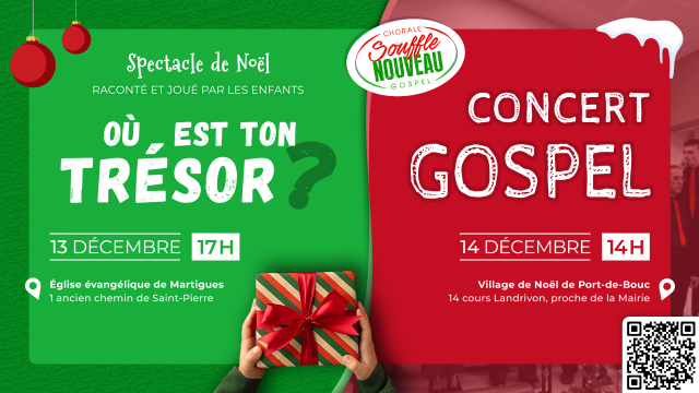 Week-end spécial Noël, avec un spectacle joué par les enfants sur le thème « Où est ton trésor ? », et un concert gospel de la chorale Souffle Nouveau le lendemain au village de Noël de Port-de-Bouc.