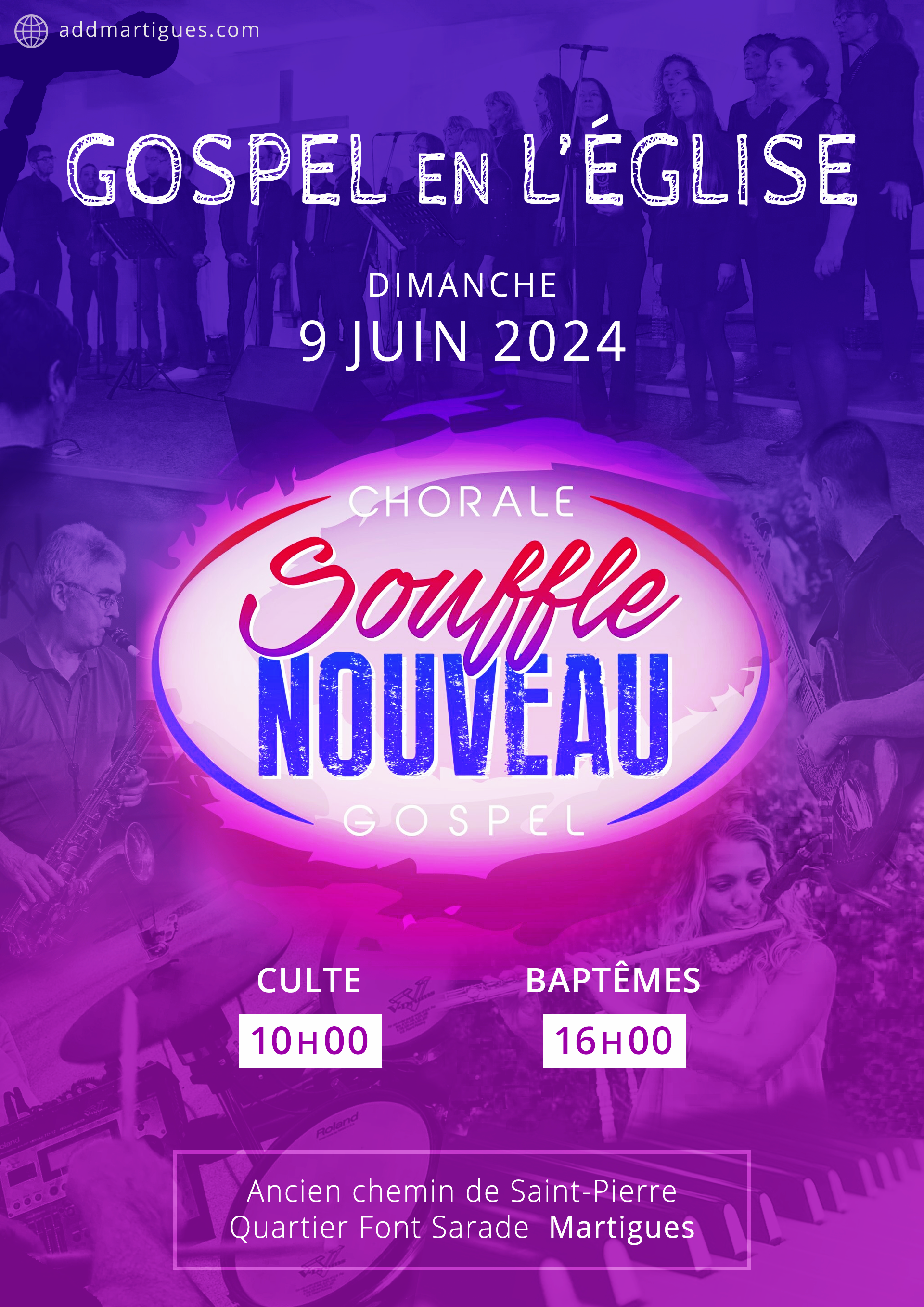 La chorale gospel Souffle Nouveau vous invite à ses concerts le dimanche 9 juin 2024. Elle interviendra pour le culte à 10h, ainsi que pour le service de baptêmes qui aura lieu à 16h.